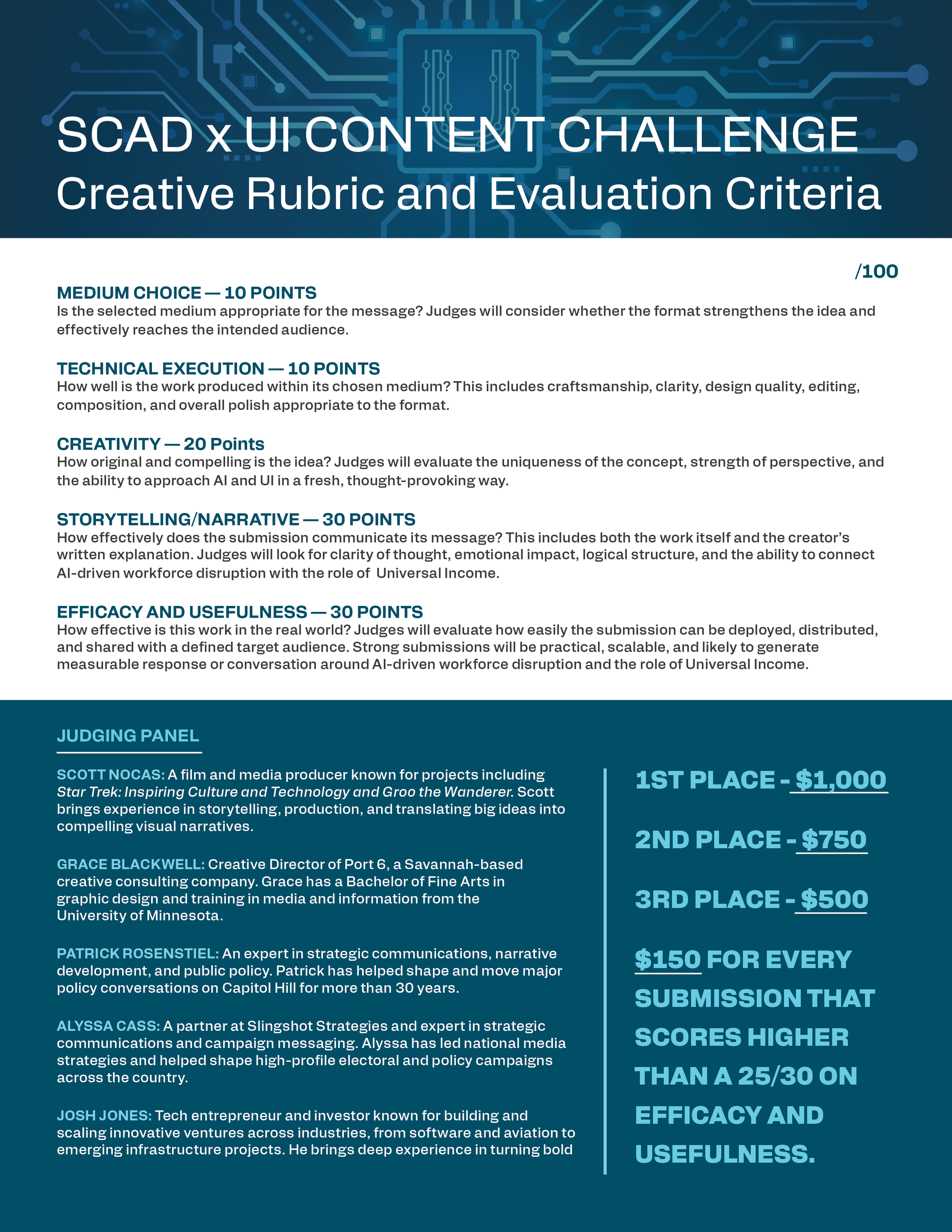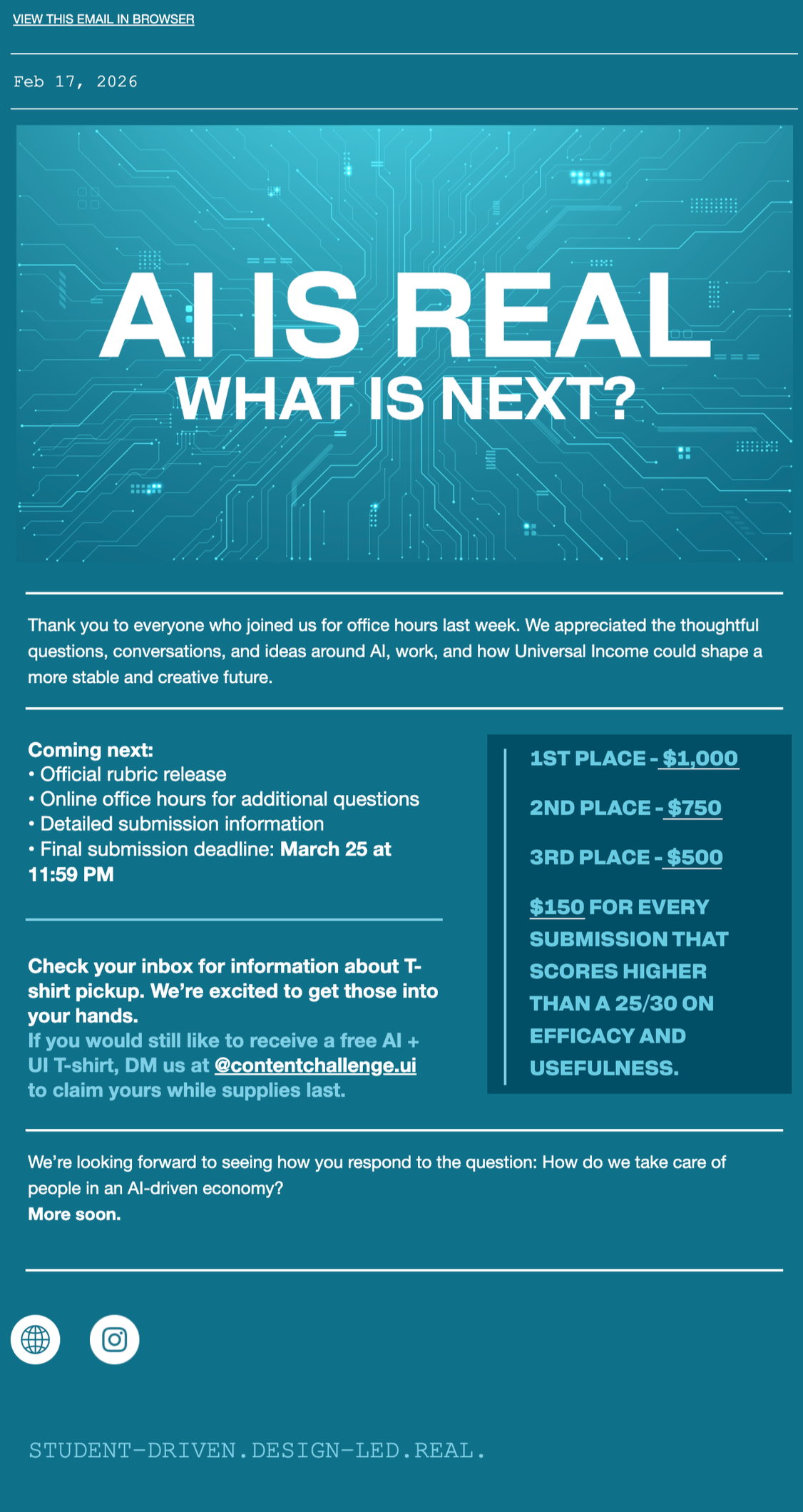 We worked with the UI Coalition to launch a content challenge inviting students to explore the future of work through the lens of AI and Universal Income. With up to $1,000 in prizes, the campaign encouraged original, real-world thinking across disciplines. We built the website, developed a cohesive social media strategy, and led an email marketing campaign to engage students and drive submissions. The result was a platform for emerging creatives to contribute to a larger conversation while building meaningful portfolio work.
